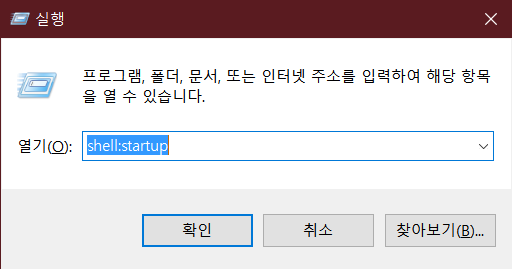 ์ฌ๊ธฐ์ shell:startup์ ์น๊ณ ์ํฐ๋ฅผ ๋๋ฅด๋ฉด ์์ ํ๋ก๊ทธ๋จ ์ฐฝ์ด ๋ฌ๋ค.