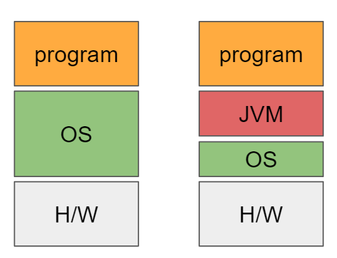 - JVM(Java Virtual Machine)์ด๋ผ๋ ๊ฐ์๋จธ์ ๋ง ํ๋์จ์ด์ ์ค์น๋์ด ์๋ค๋ฉด ์ด๋ค ํ๋ซํผ์ด๋ ๋์ผํ ํ์ผ๋ก ๋์ผํ ์์ ์ ์คํํ ์ ์๋ค.