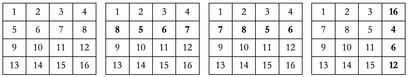 ์๊ทผ์ด๋ N×N ํ๋ฅผ ๋ง๋ค์๋ค. ํ์๋ 1๋ถํฐ N2๊น์ง์ ์๊ฐ ํ ์ฐ์ ์์(row-major order)์ ๋ฐ๋ผ ์ฐ์ฌ์ ธ ์๋ค. ํ๊ฐ ์ํํ ์ ์๋ ์ฐ์ฐ์ ์๋์ ๊ฐ์ด ๋ ๊ฐ์ง์ด๋ค.