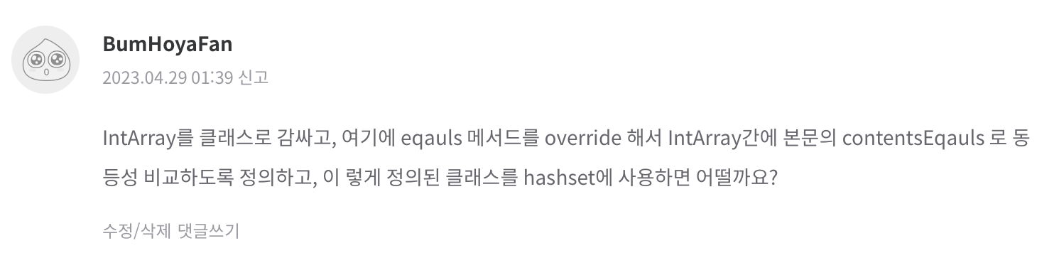 ๊ทธ๋ฌ๋ HashSet<IntArray>๋ ๋์ผ์ฑ์ ๋น๊ตํด ์ฃผ๋ฉด์, ์๋ฒฝํ ๋๋ฑํ ์์๊ฐ ๋ค์ด์ค๋๋ผ๋ ์ฃผ์๊ฐ์ ํตํด set ๋ด๋ถ ์์ ์ค๋ณต์ ์ฒดํฌํ๊ธฐ ๋๋ฌธ์ ๊ธฐ๋ํ๋ ๋๋ก ๋์ํ์ง ์๋๋ค...๊ณ ๋ง์๋๋ ธ์์ฃ .
